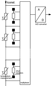 For both designs the signals from the shunt resistors are connected to a multiplexer which automatically switches the signals to an amplifier and evaluation electronic with Analog-to-Digital converter. This is shown in the following picture.